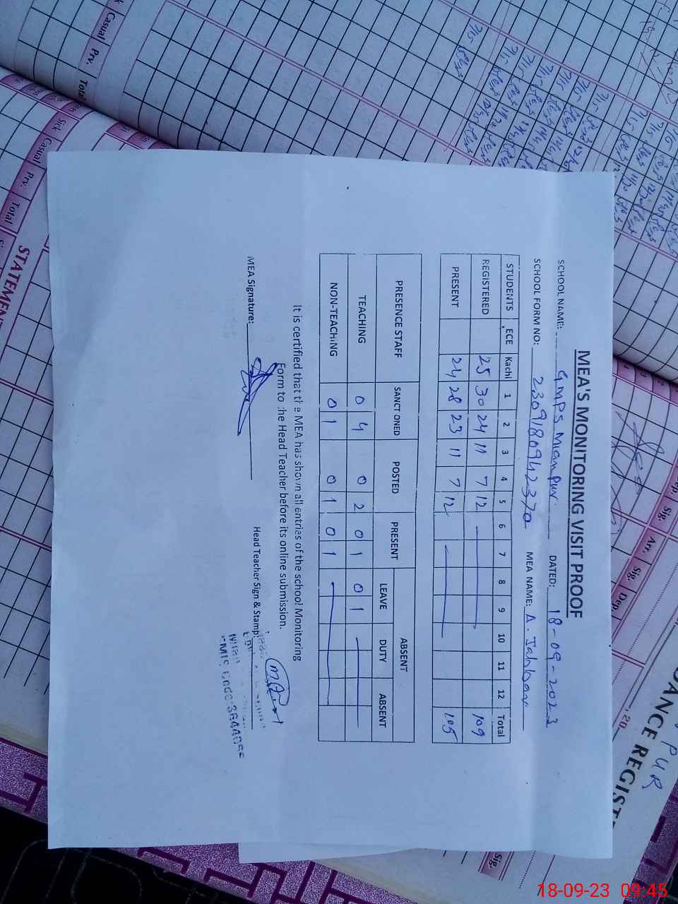 | Attendance Register | Head Teacher | MEA with School | Visit Proof |