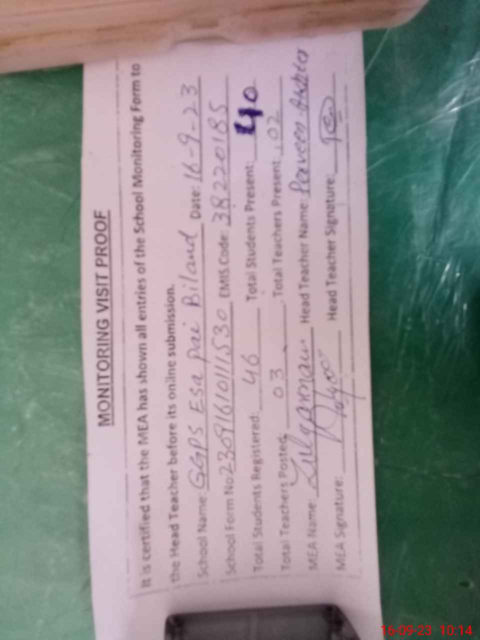 | Attendance Register | Head Teacher | MEA with School | Visit Proof |
