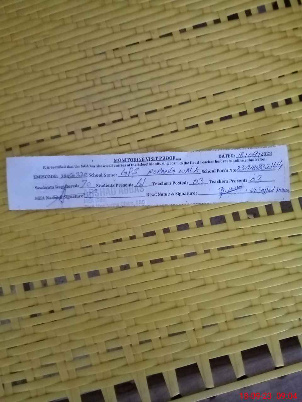 | Attendance Register | Head Teacher | MEA with School | Visit Proof |