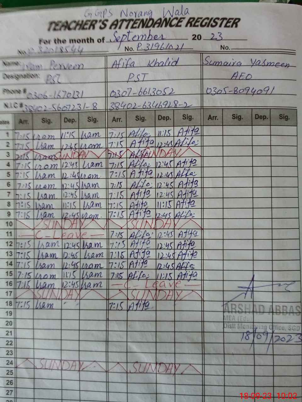 | Name: IR**** PA**** Designation: (School Headmaster's/Headmistress's) PST SCI MATH Phone/Cell Number: 03**** |