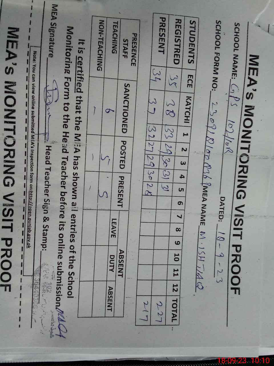 | Monitoring Date: 18-09-2023 | Start Time: 18-09-2023 09:39 AM | End Time: 18-09-2023 10:13 AM | Name of MEA: M.Is**** (S**** 03**** | |