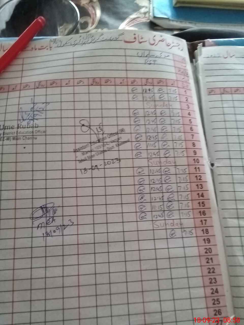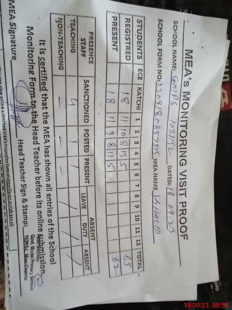 | Attendance Register | Head Teacher | MEA with School | Visit Proof |