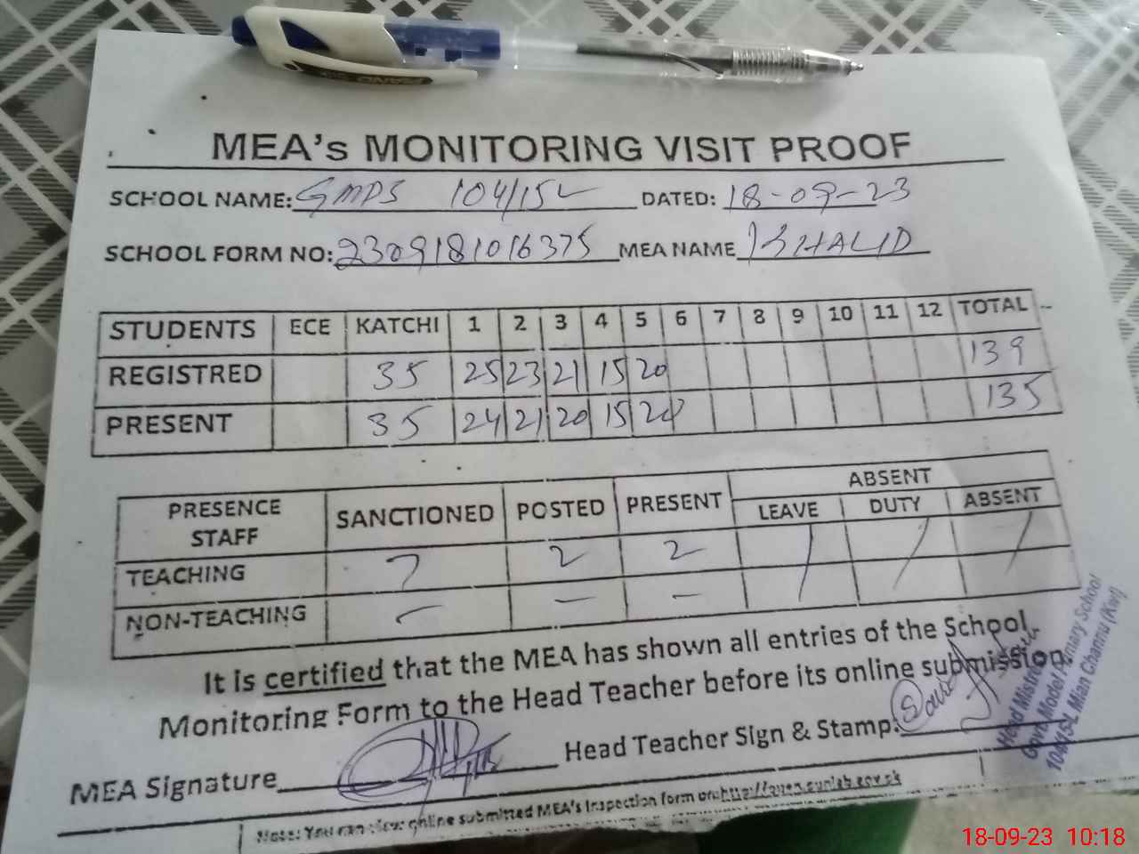 | Attendance Register | Head Teacher | MEA with School | Visit Proof |