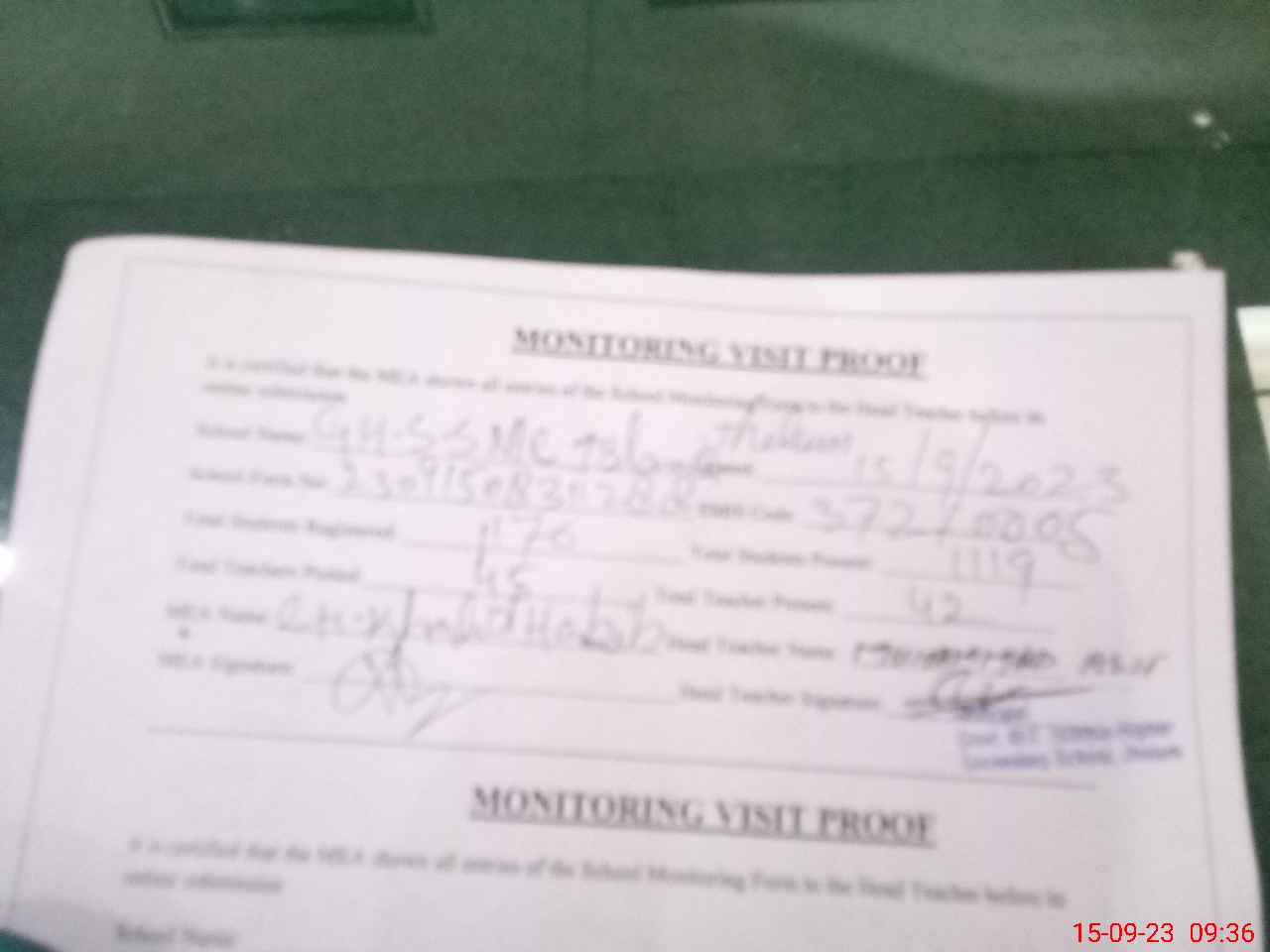 | Monitoring Date: 15-09-2023 | Start Time: 15-09-2023 08:31 AM | End Time: 15-09-2023 09:45 AM | Name of MEA: Kh**** ha**** | |