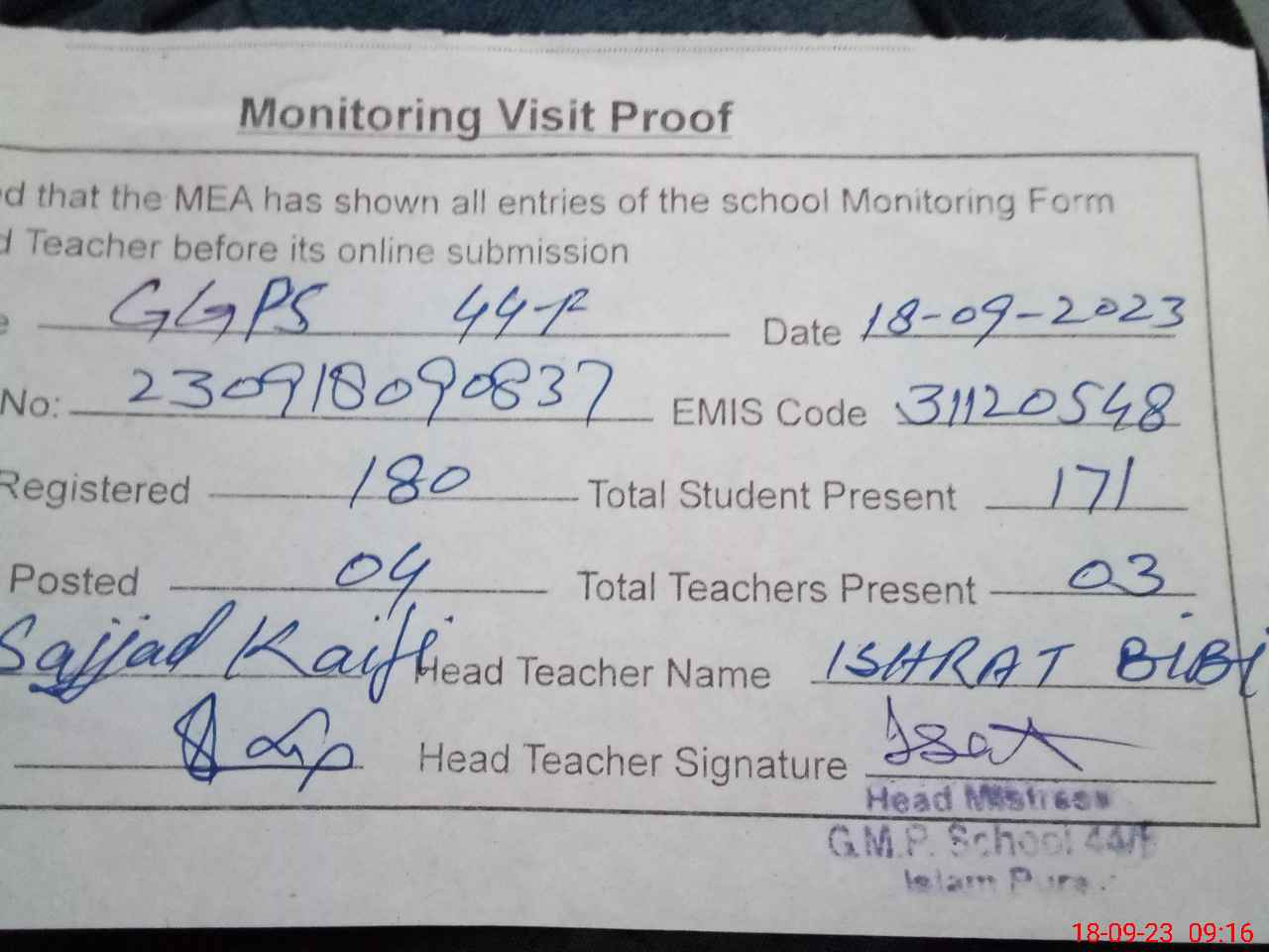 | Attendance Register | Head Teacher | MEA with School | Visit Proof |