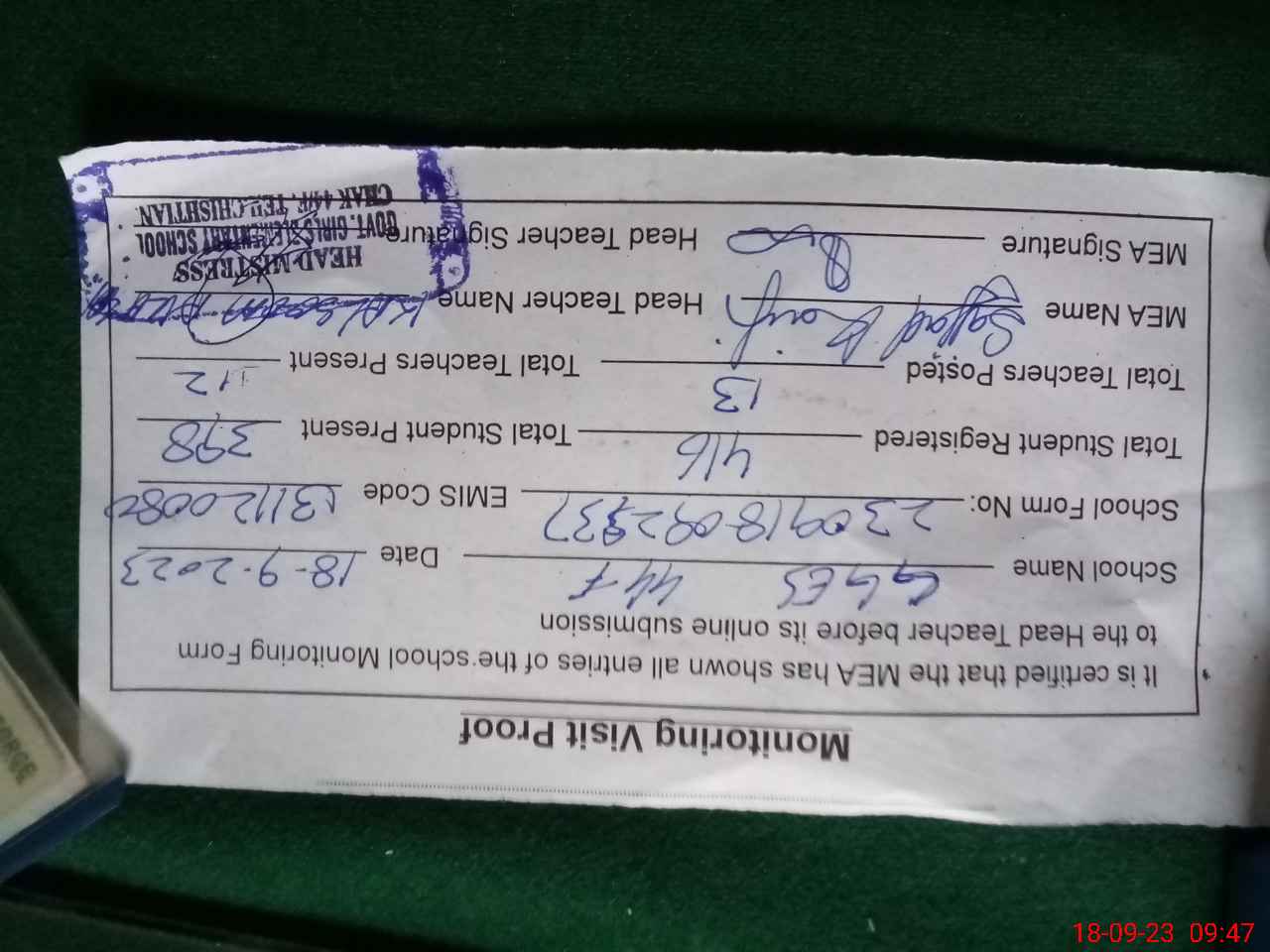 | Attendance Register | Head Teacher | MEA with School | Visit Proof |