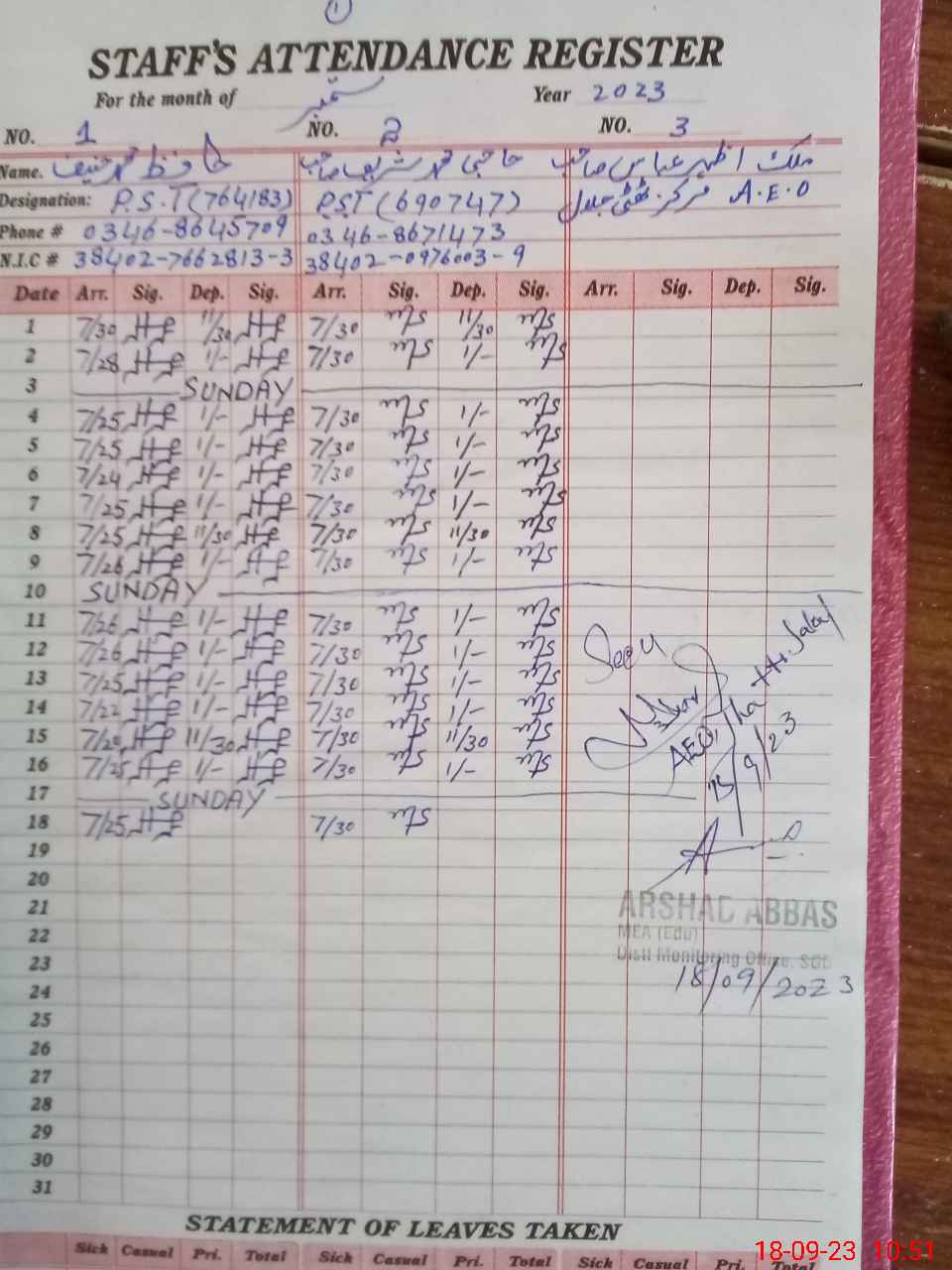 | CNIC | Full Name | Designation | R/C | Absence during last cal. month |