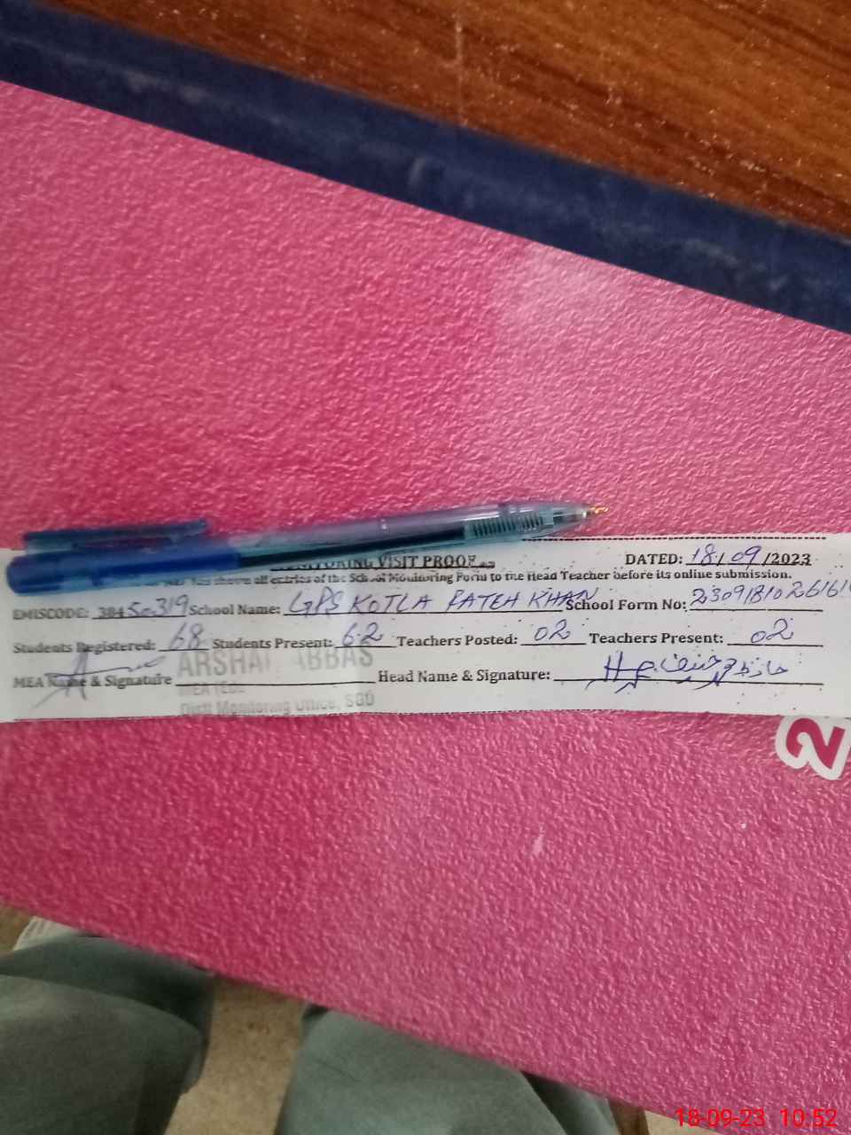 | Attendance Register | Head Teacher | MEA with School | Visit Proof |