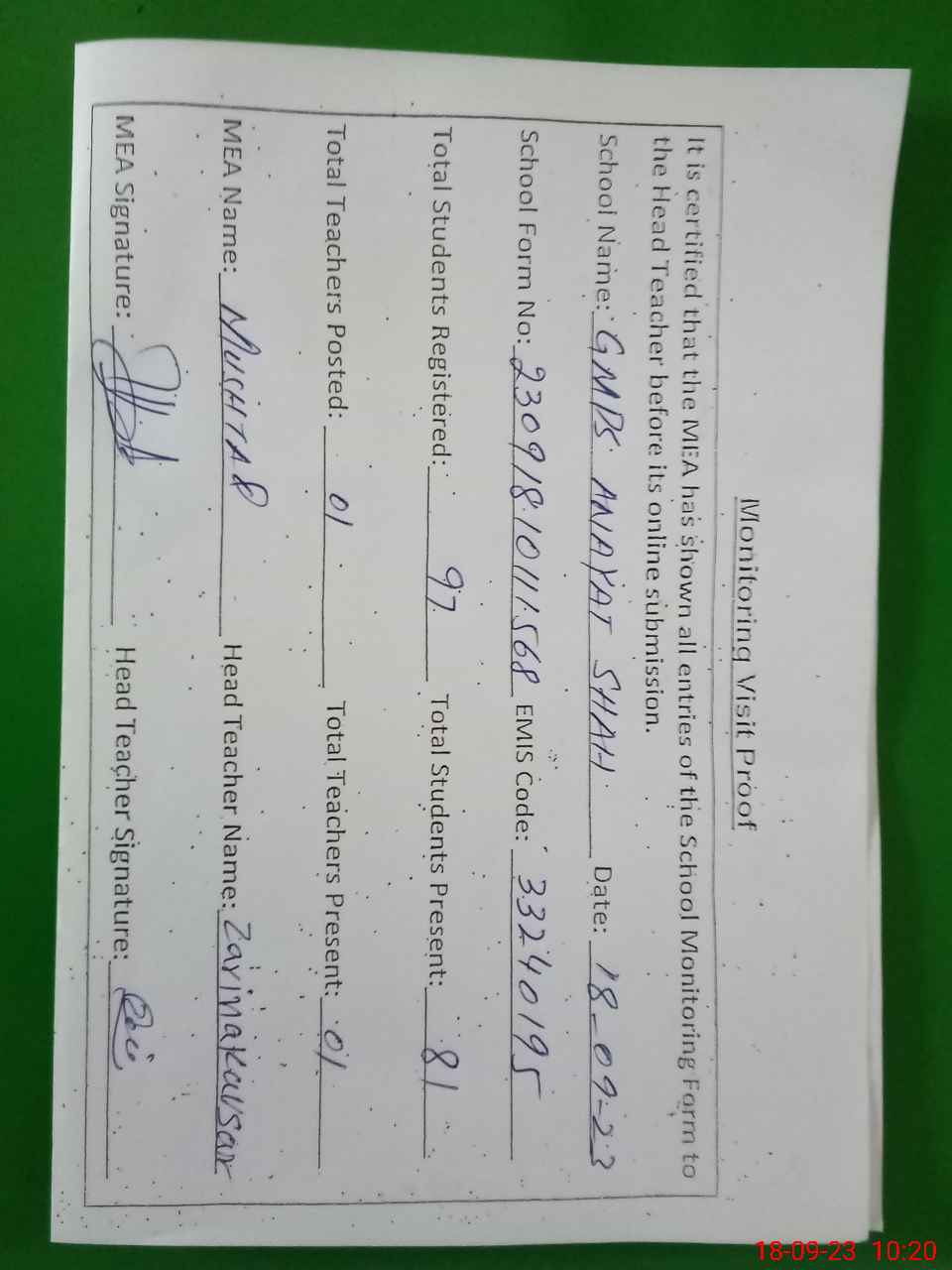 | Attendance Register | Head Teacher | MEA with School | Visit Proof |