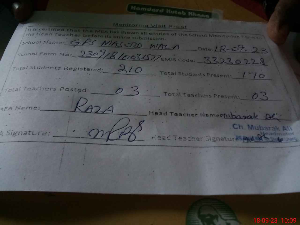 | EMIS Code: 33230228 | Name of School: GPS MASJID WALA | |||