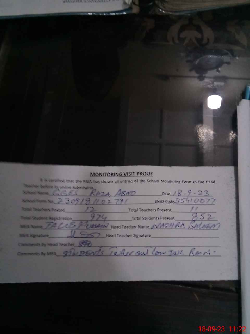 | Attendance Register | Head Teacher | MEA with School | Visit Proof |