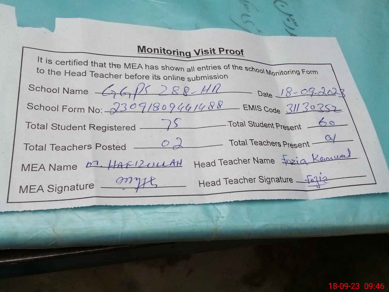 | EMIS Code: 31130352 | Name of School: GGPS CHAK NO 288 HR | |||