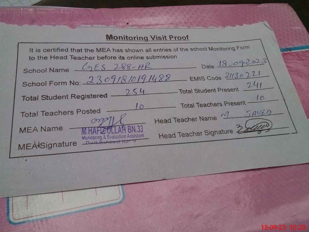 | Attendance Register | Head Teacher | MEA with School | Visit Proof |