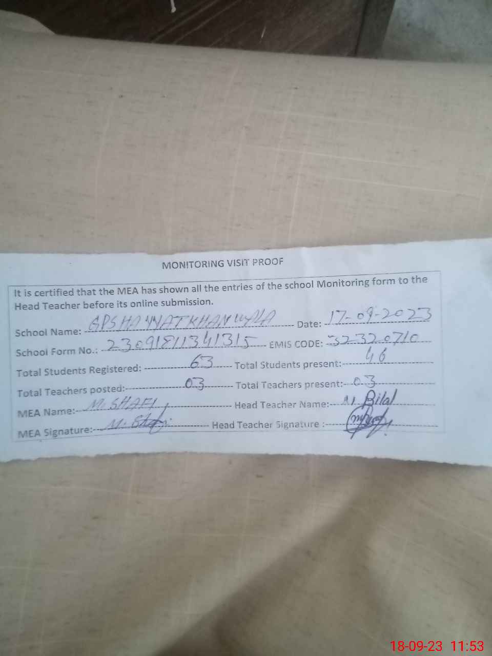 | Monitoring Date: 18-09-2023 | Start Time: 18-09-2023 11:11 AM | End Time: 18-09-2023 11:53 AM | Name of MEA: MU**** SH**** | |