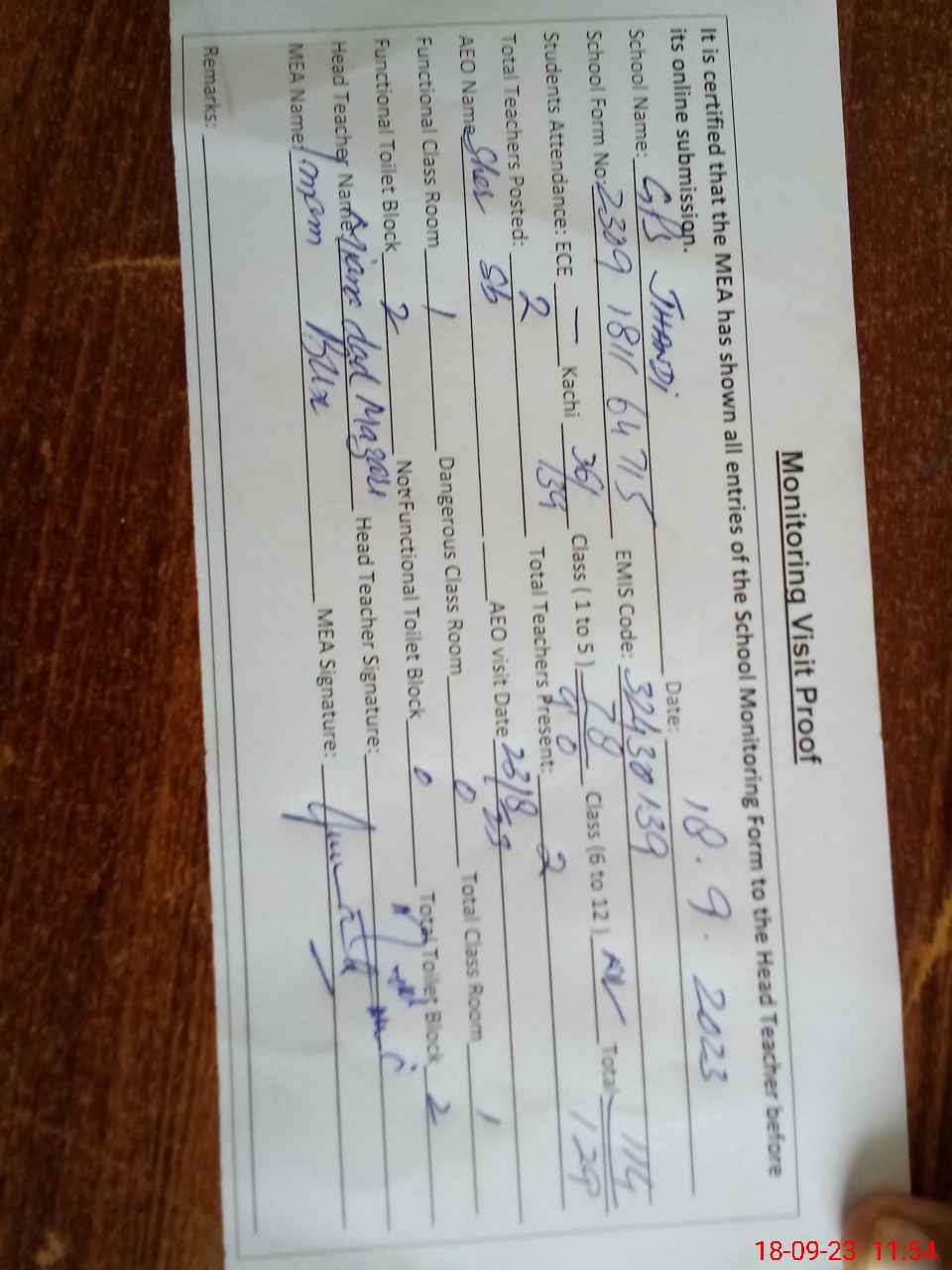 | Attendance Register | Head Teacher | MEA with School | Visit Proof |