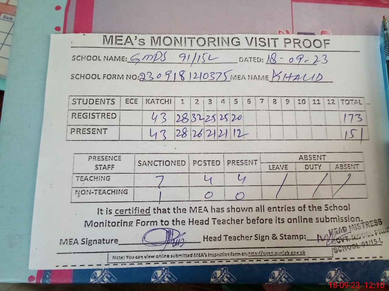 | Attendance Register | Head Teacher | MEA with School | Visit Proof |