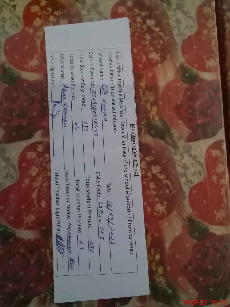 | Attendance Register | Head Teacher | MEA with School | Visit Proof |