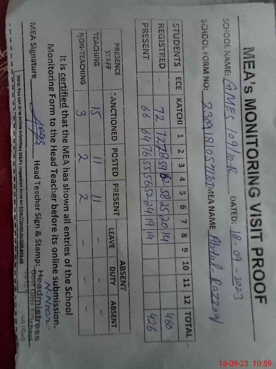 | Attendance Register | Head Teacher | MEA with School | Visit Proof |