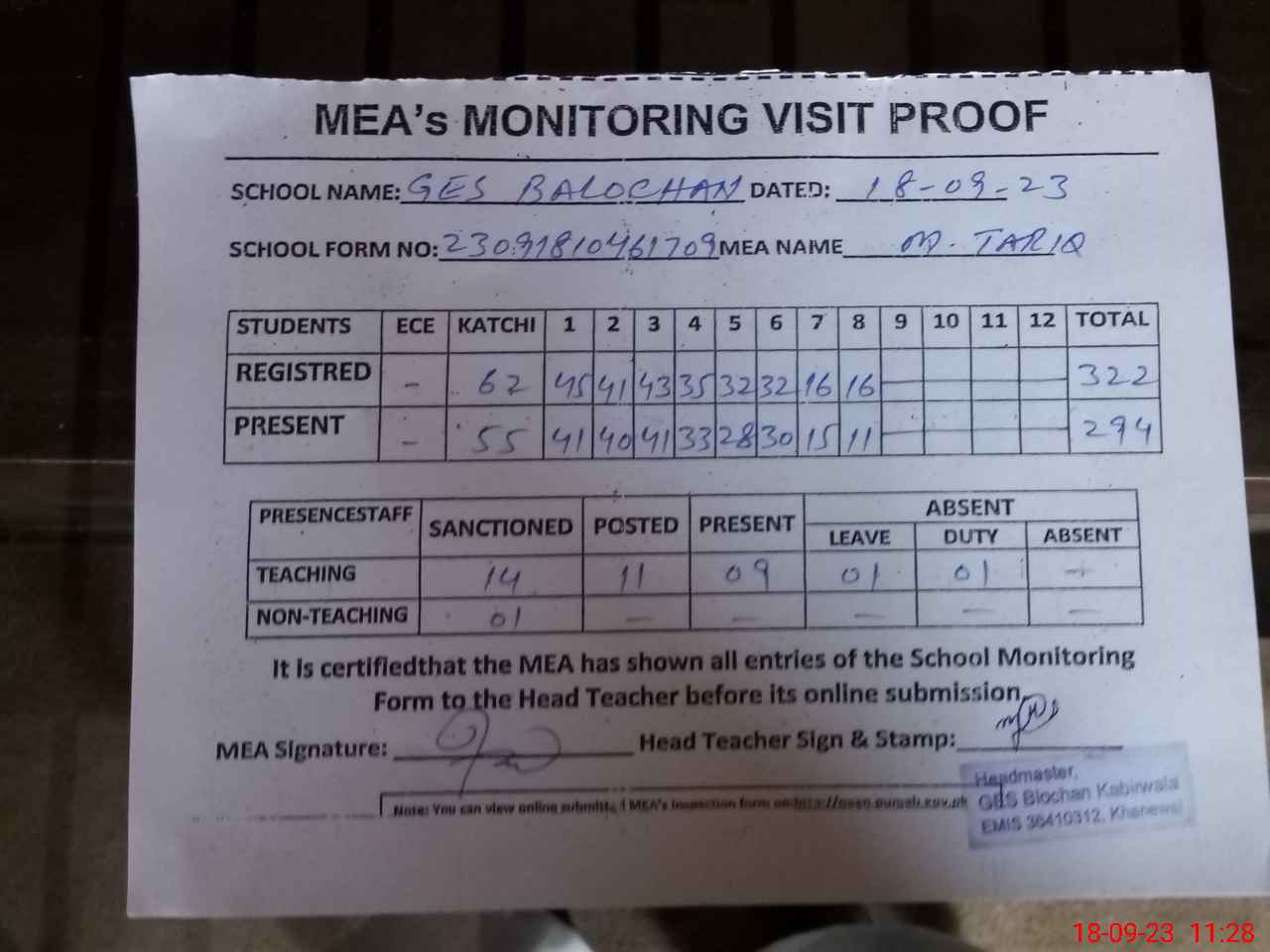 | Attendance Register | Head Teacher | MEA with School | Visit Proof |