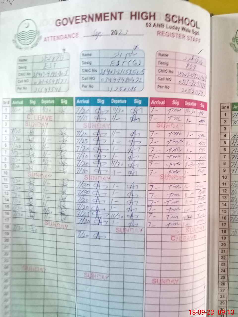 | CNIC | Full Name | Designation | R/C | Absence during last cal. month |
