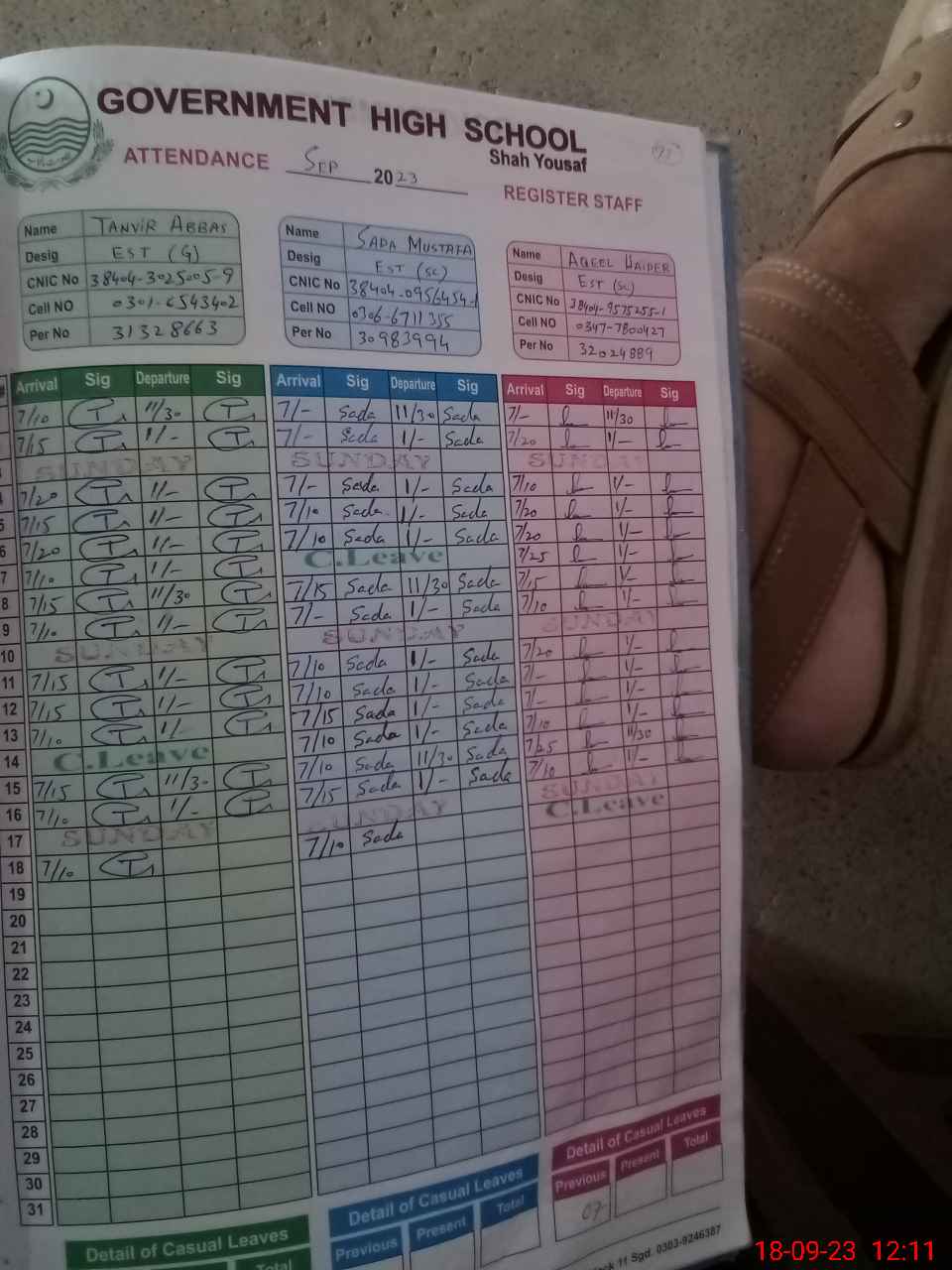 | CNIC | Full Name | Designation | R/C | Absence during last cal. month |