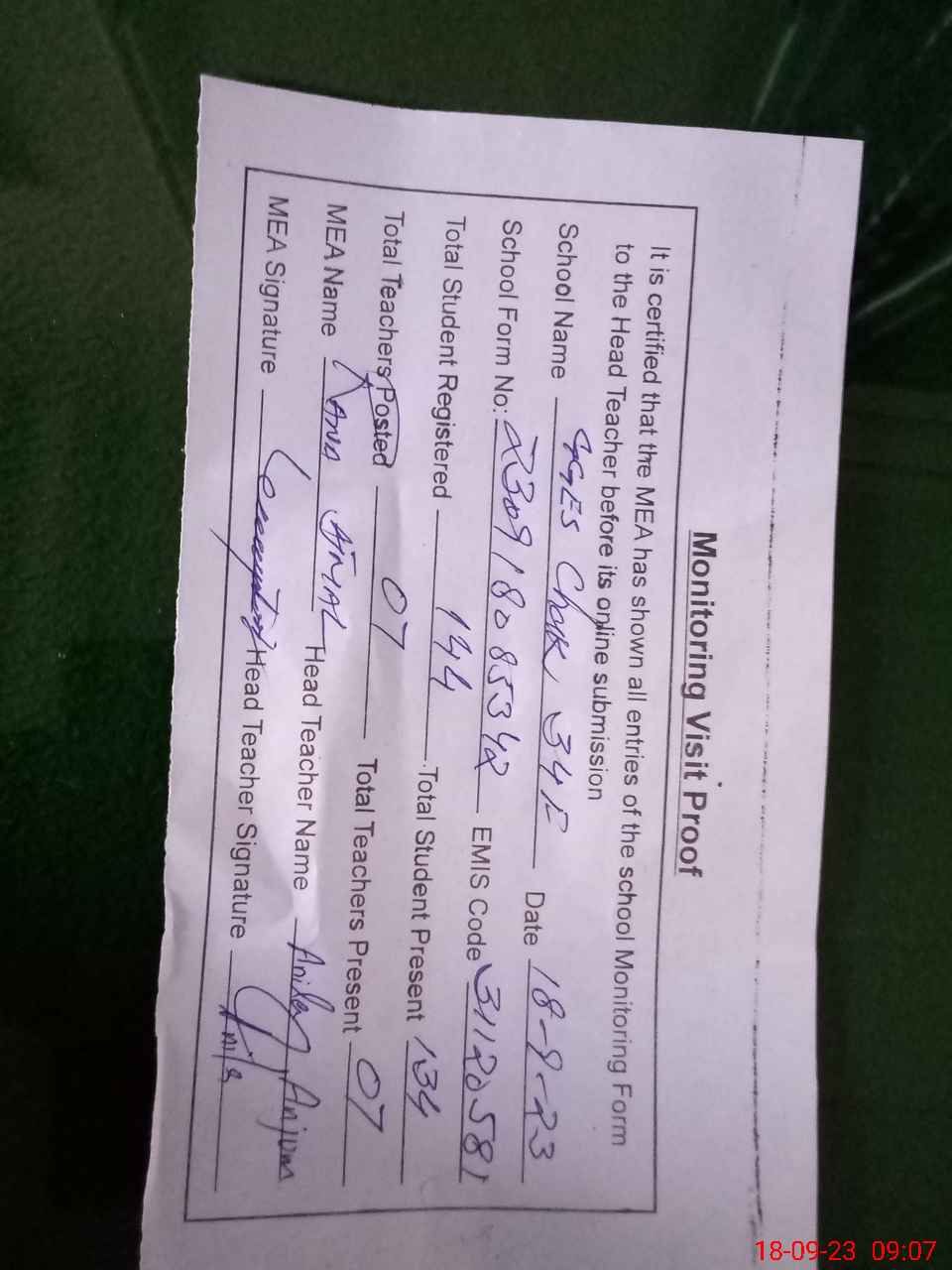 | Attendance Register | Head Teacher | MEA with School | Visit Proof |
