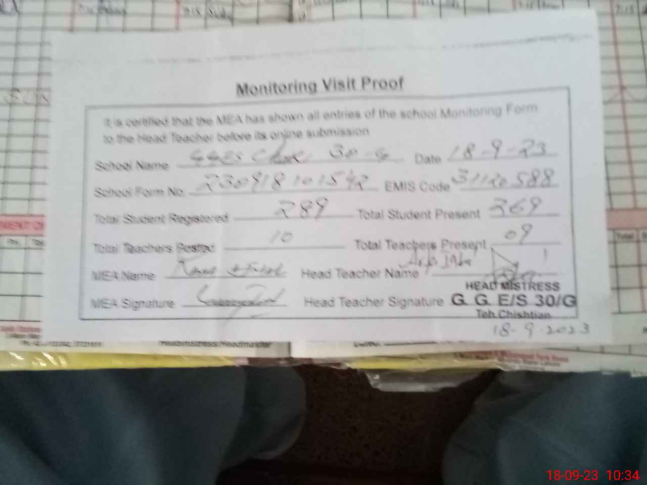 | Attendance Register | Head Teacher | MEA with School | Visit Proof |