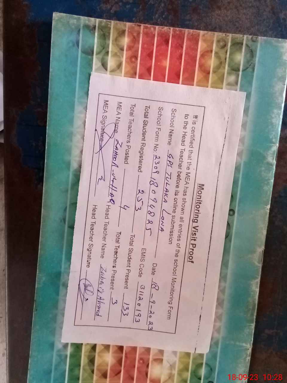 | Attendance Register | Head Teacher | MEA with School | Visit Proof |