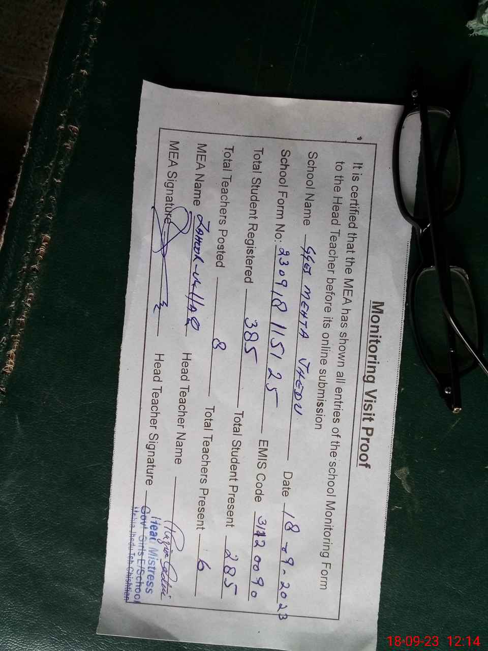 | Attendance Register | Head Teacher | MEA with School | Visit Proof |