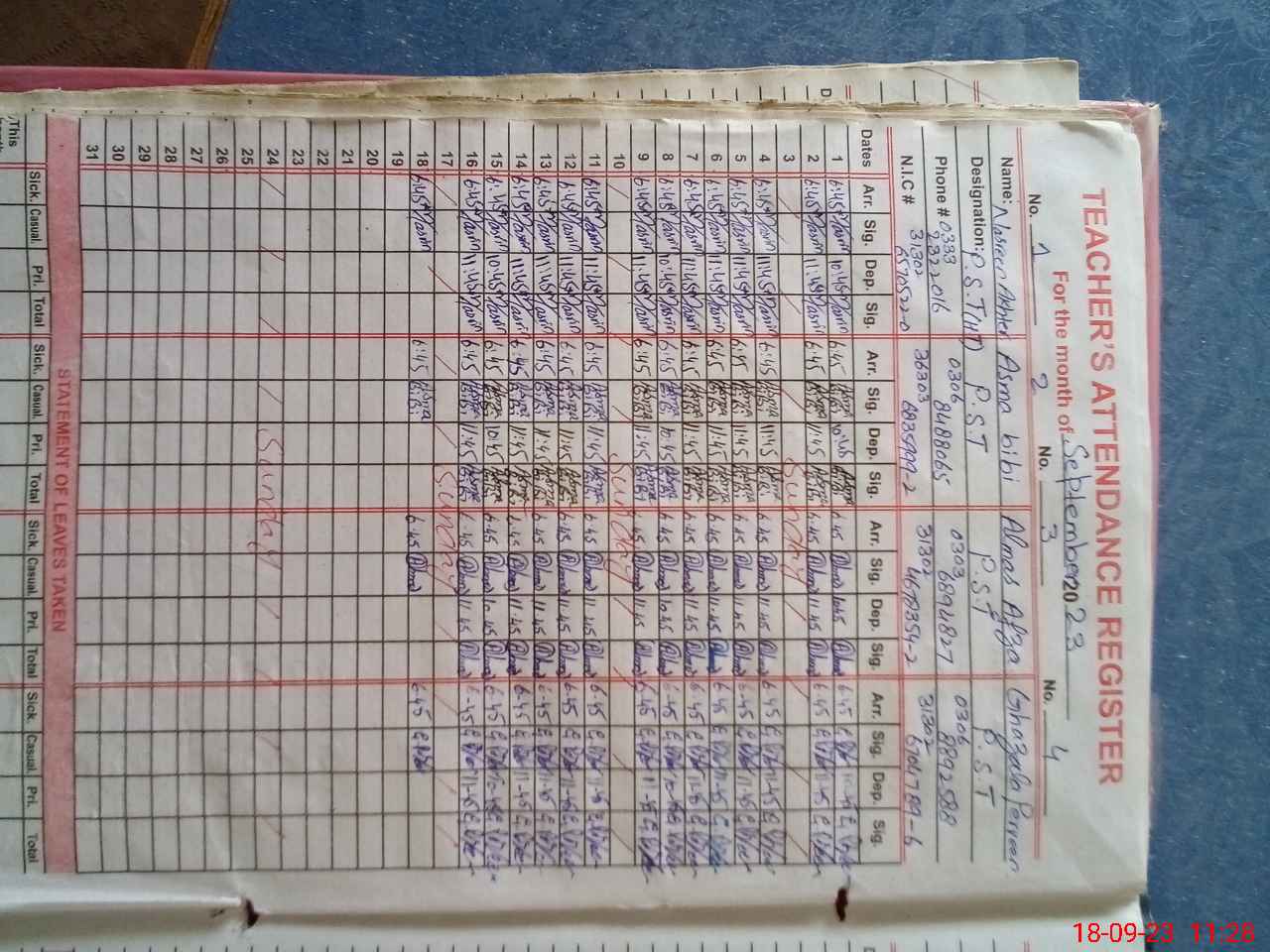 | Name: NA**** AK**** Designation: (School Headmaster's/Headmistress's) PST Phone/Cell Number: 03**** |