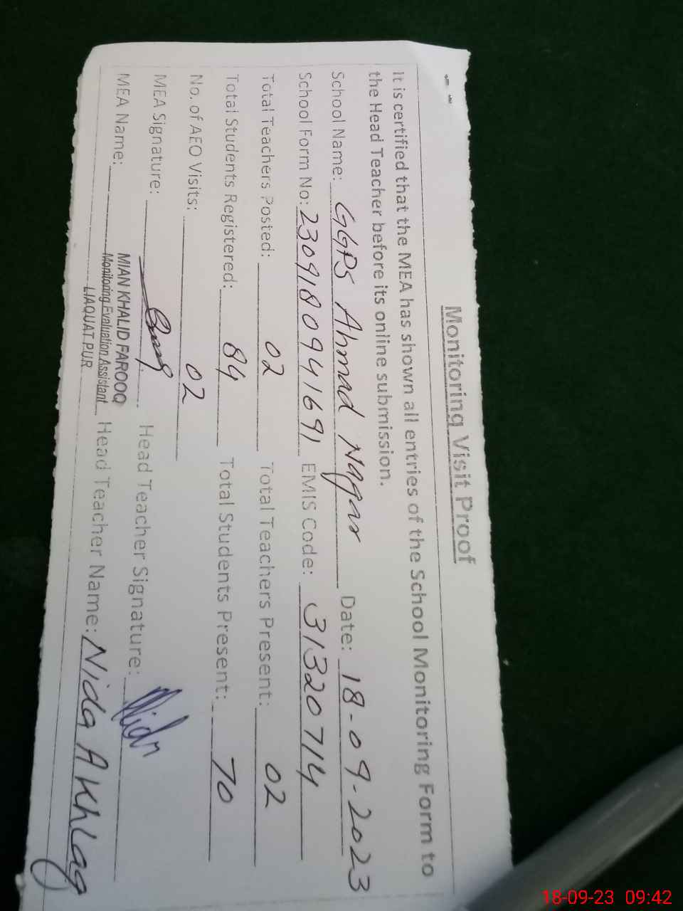 | Attendance Register | Head Teacher | MEA with School | Visit Proof |
