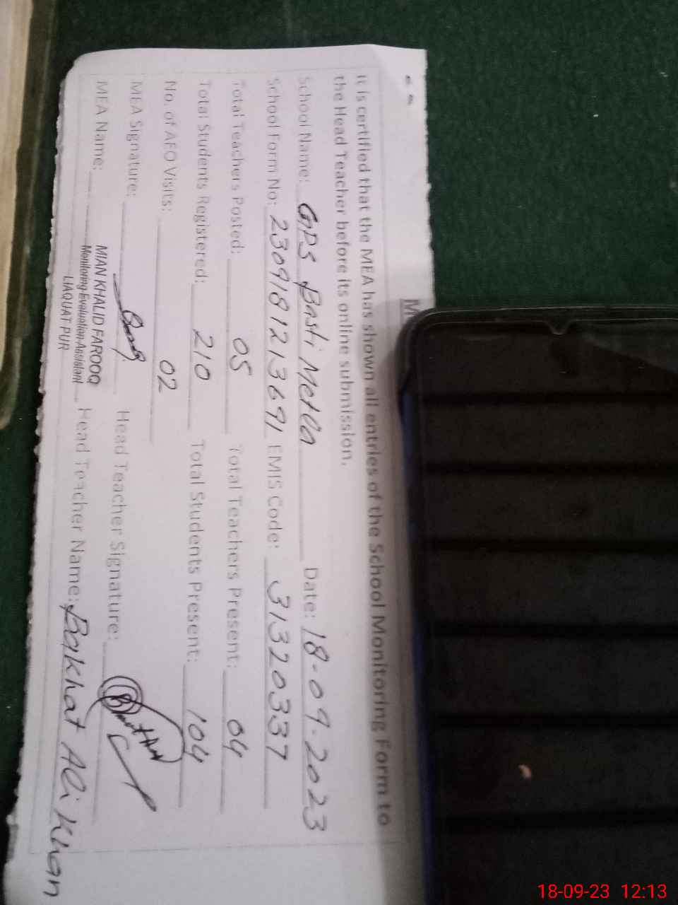 | Name: Kh**** M.Na**** Ab**** Designation: (School Headmaster's/Headmistress's) EST Phone/Cell Number: 03**** |