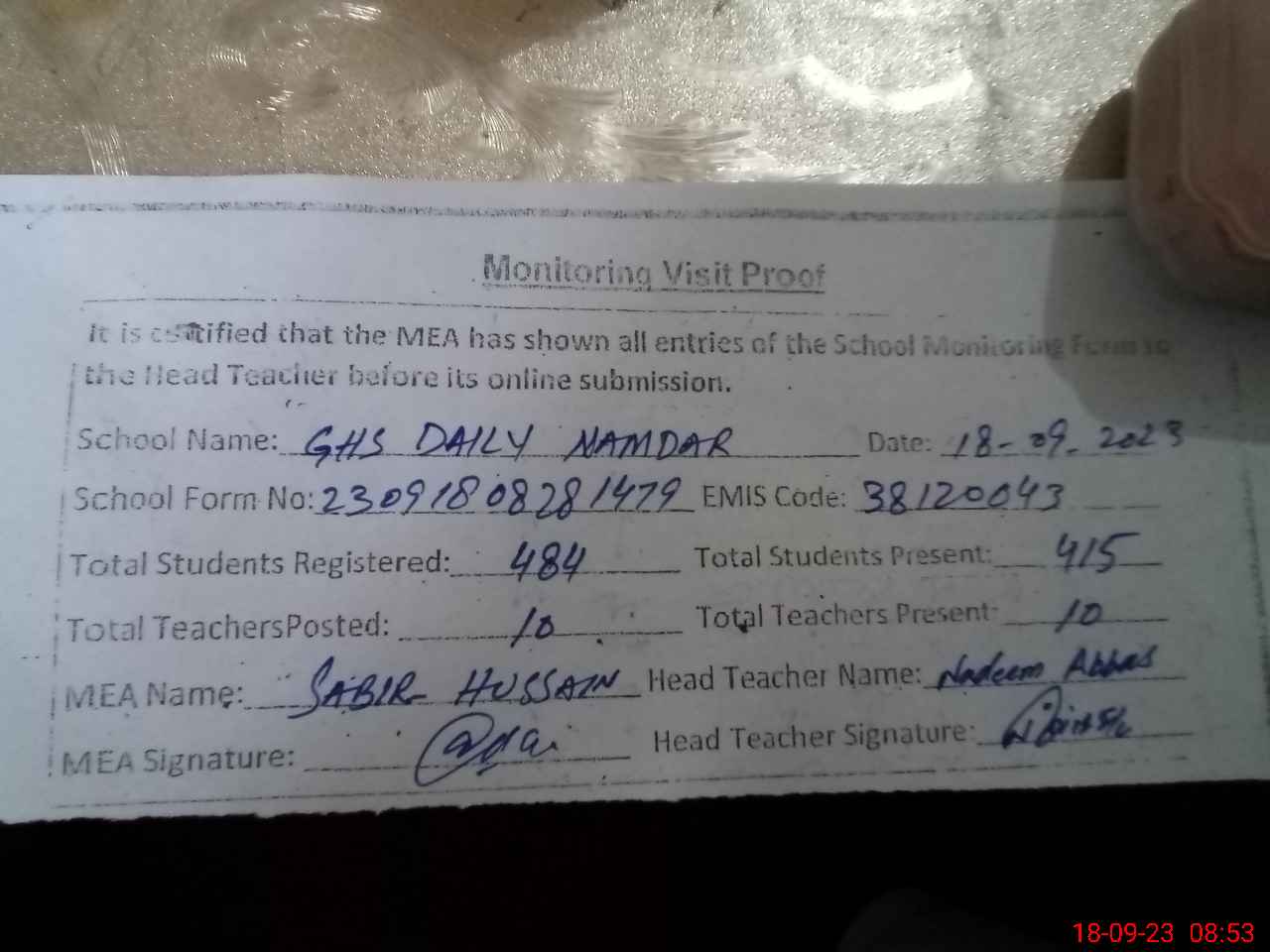 | EMIS Code: 38120043 | Name of School: GHS DAILY NAMDAR | |||