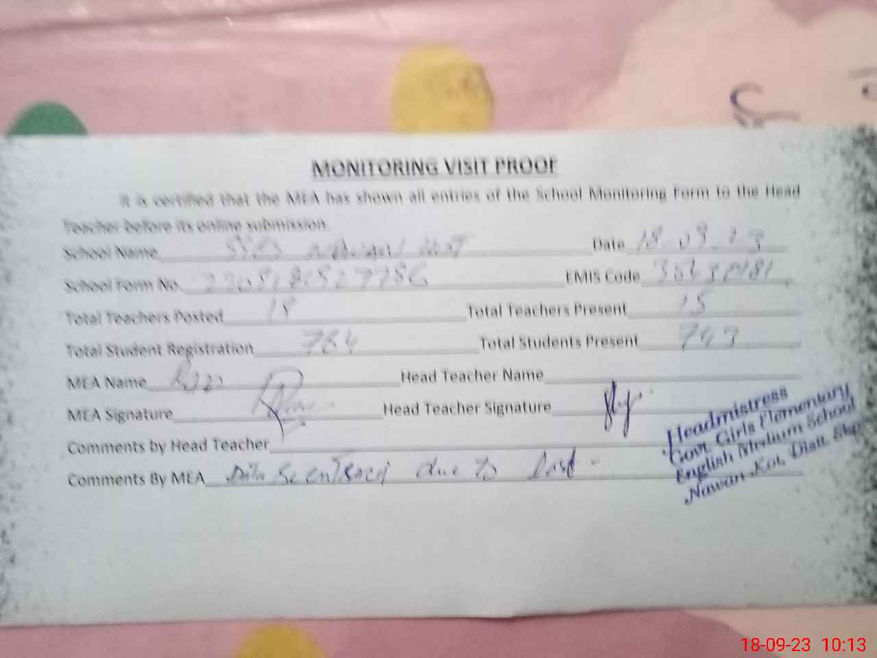 | Attendance Register | Head Teacher | MEA with School | Visit Proof |