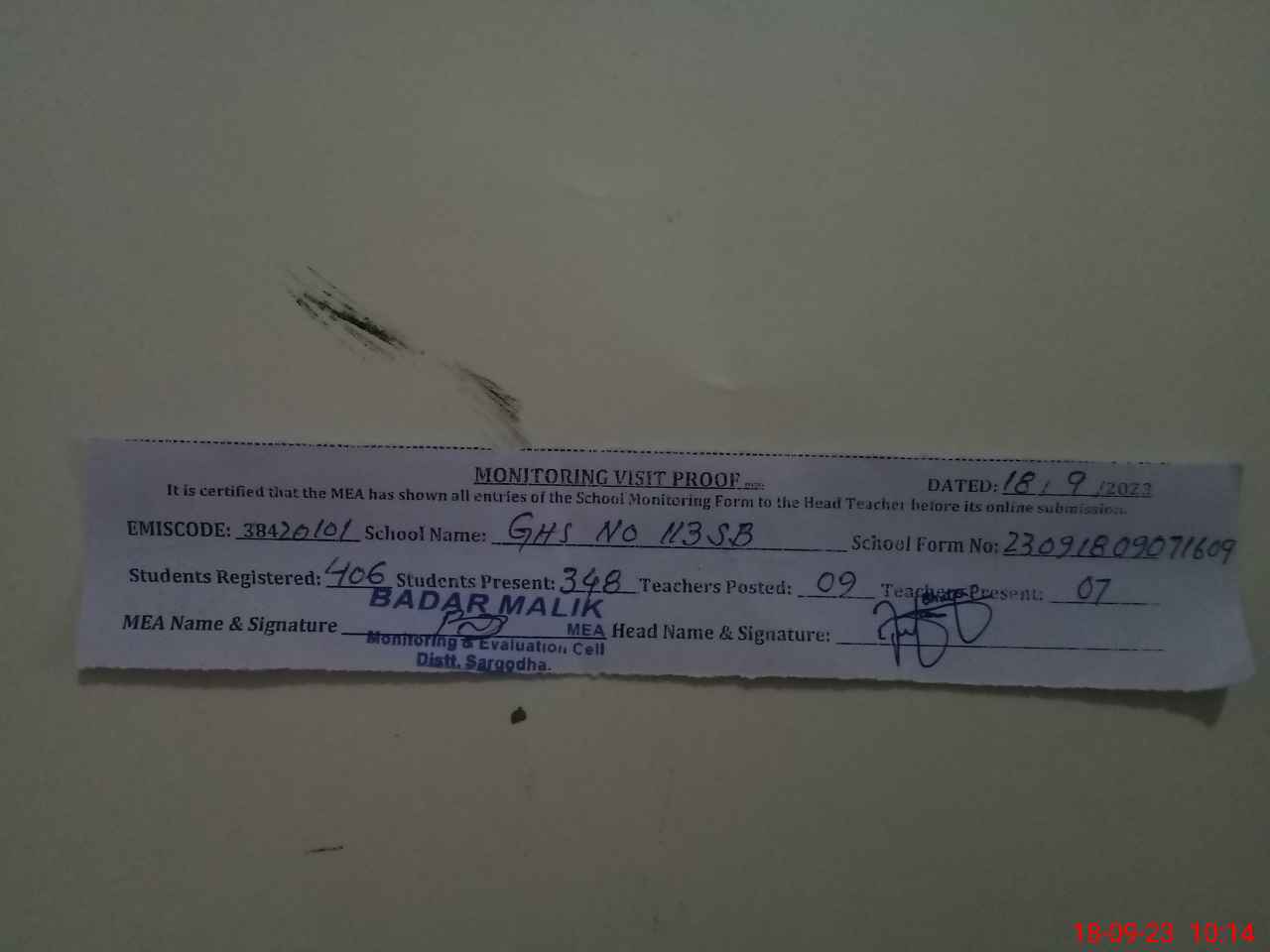 | EMIS Code: 38420101 | Name of School: GHS CHAK NO.113 SB | |||