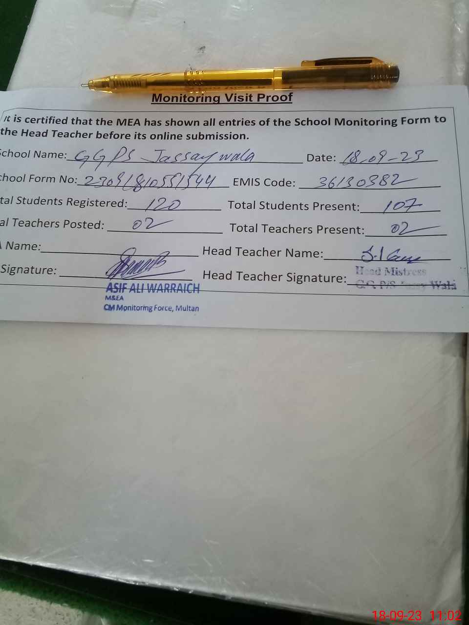 | EMIS Code: 36130382 | Name of School: GGPS JASSAY WALA QADIRPUR LAR | |||