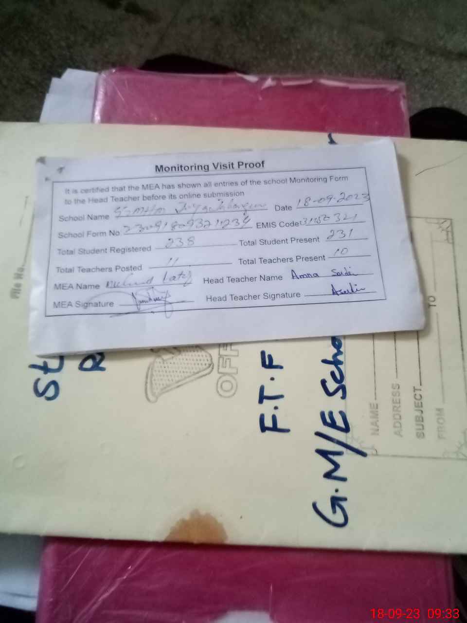 | Attendance Register | Head Teacher | MEA with School | Visit Proof |