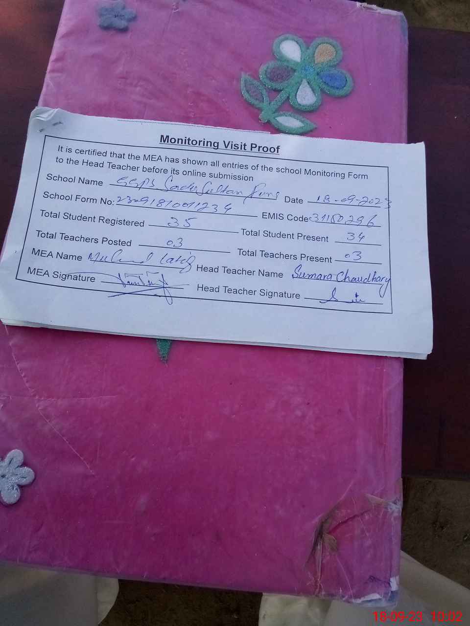 | Attendance Register | Head Teacher | MEA with School | Visit Proof |