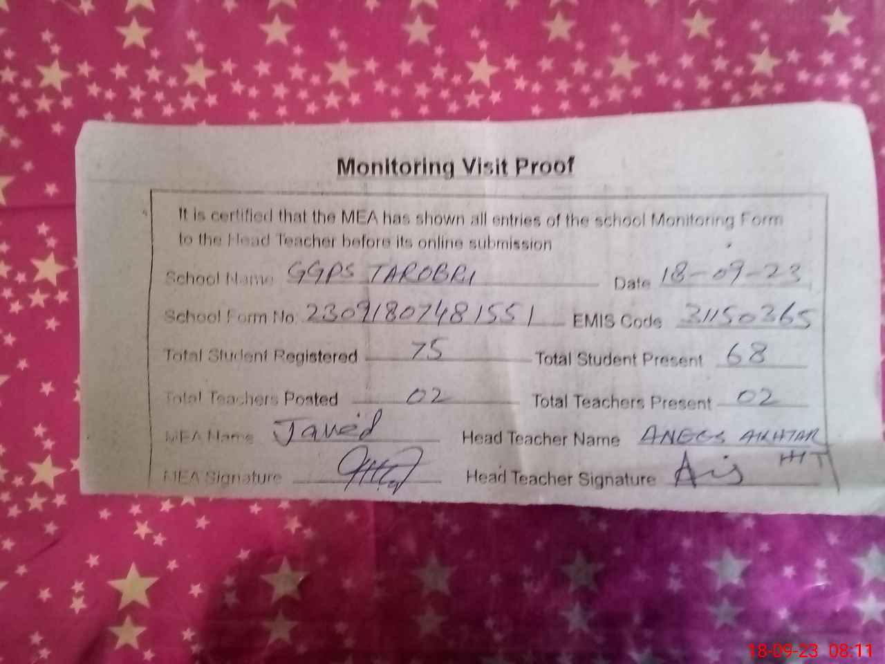 | Attendance Register | Head Teacher | MEA with School | Visit Proof |