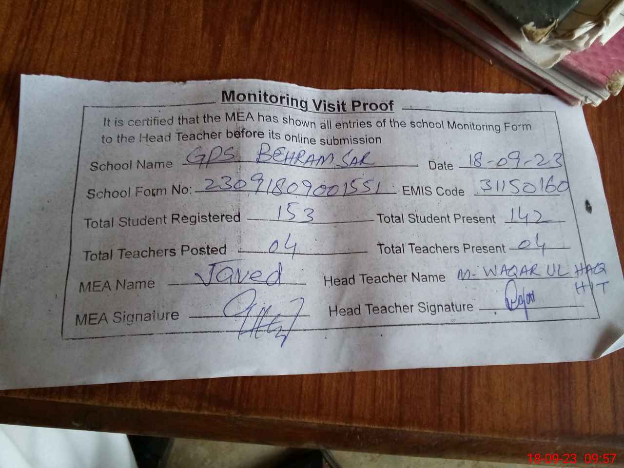 | EMIS Code: 31150160 | Name of School: GPS BEHRAAM SAR | |||