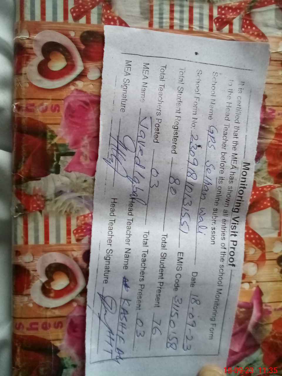 | Attendance Register | Head Teacher | MEA with School | Visit Proof |