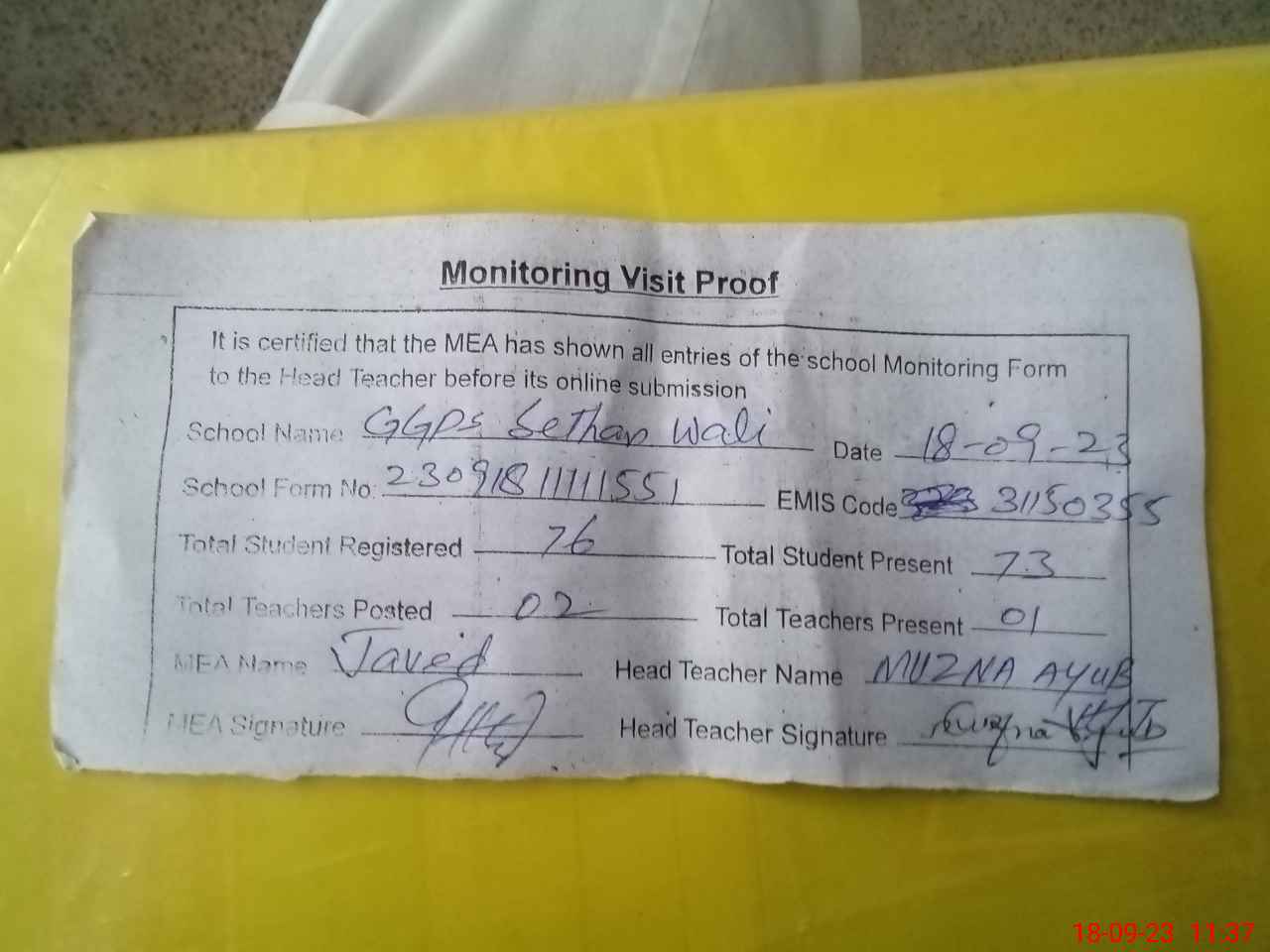 | Attendance Register | Head Teacher | MEA with School | Visit Proof |