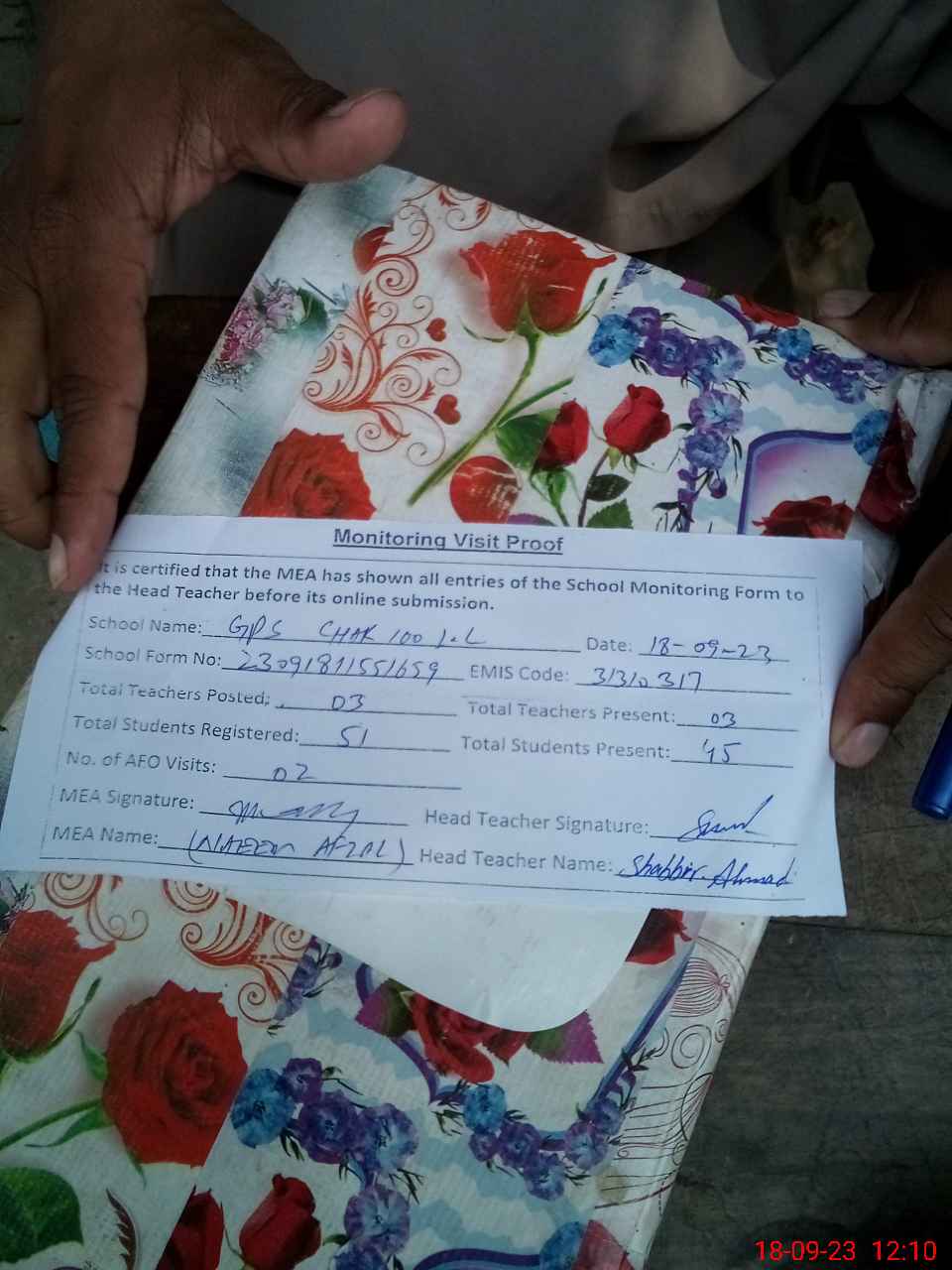 | EMIS Code: 31310317 | Name of School: GPS CHAK NO. 100/1-L | |||
