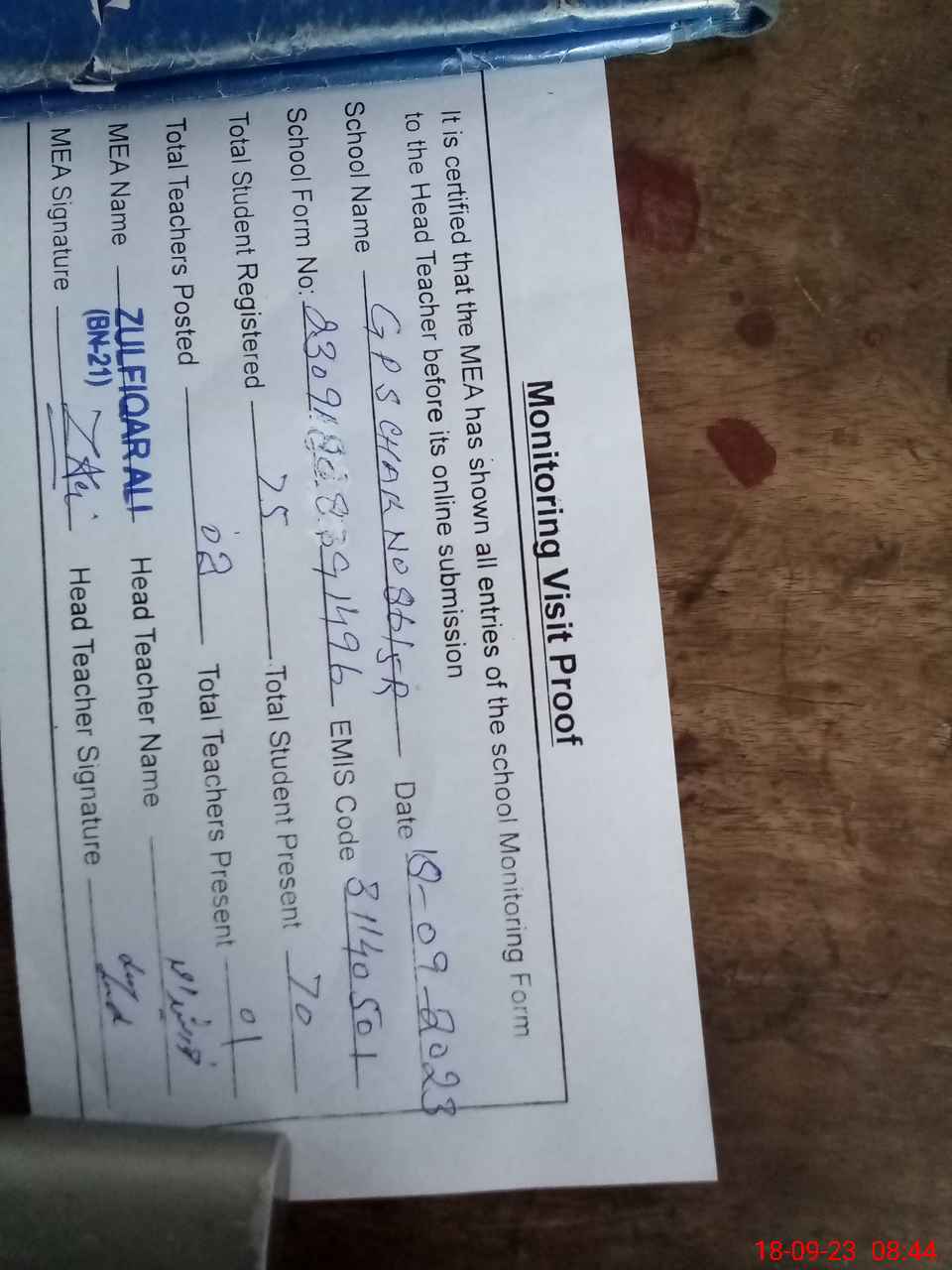 | Attendance Register | Head Teacher | MEA with School | Visit Proof |