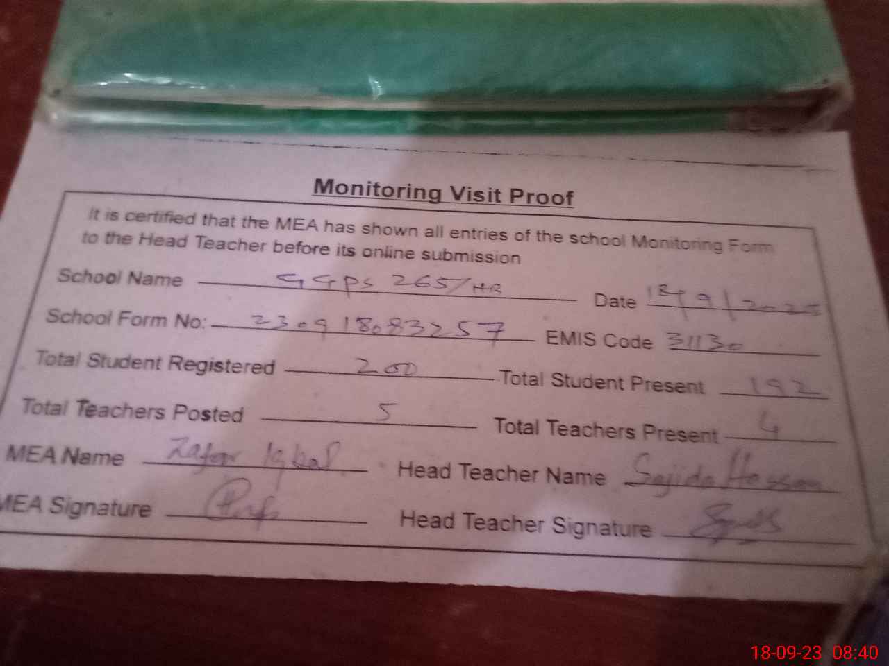| EMIS Code: 31130288 | Name of School: GGPS CHAK NO 265 HR | |||