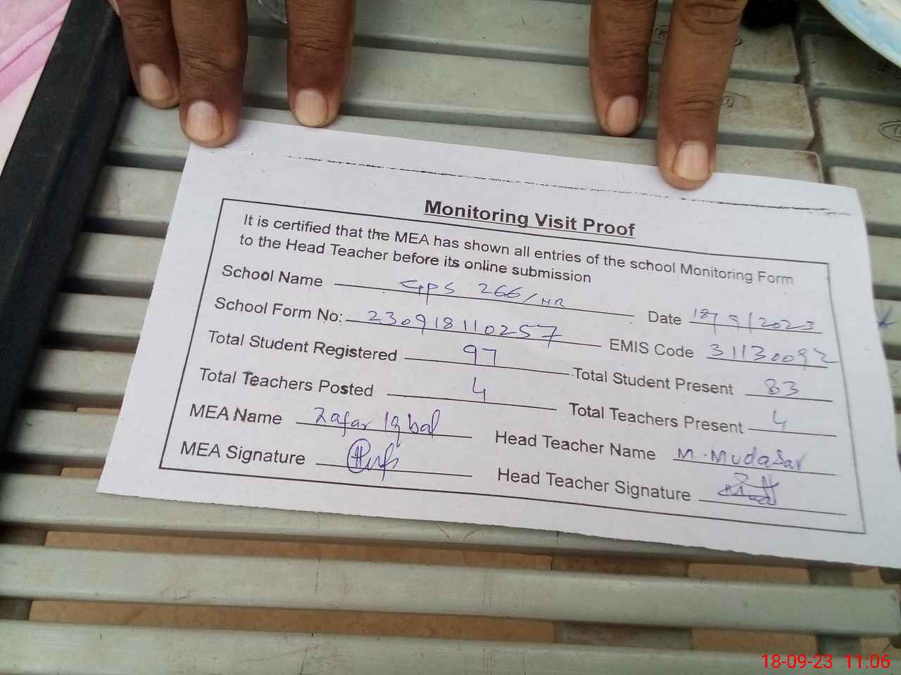 | Attendance Register | Head Teacher | MEA with School | Visit Proof |