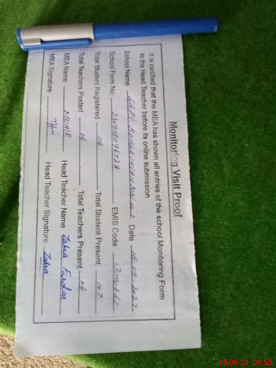 | Attendance Register | Head Teacher | MEA with School | Visit Proof |