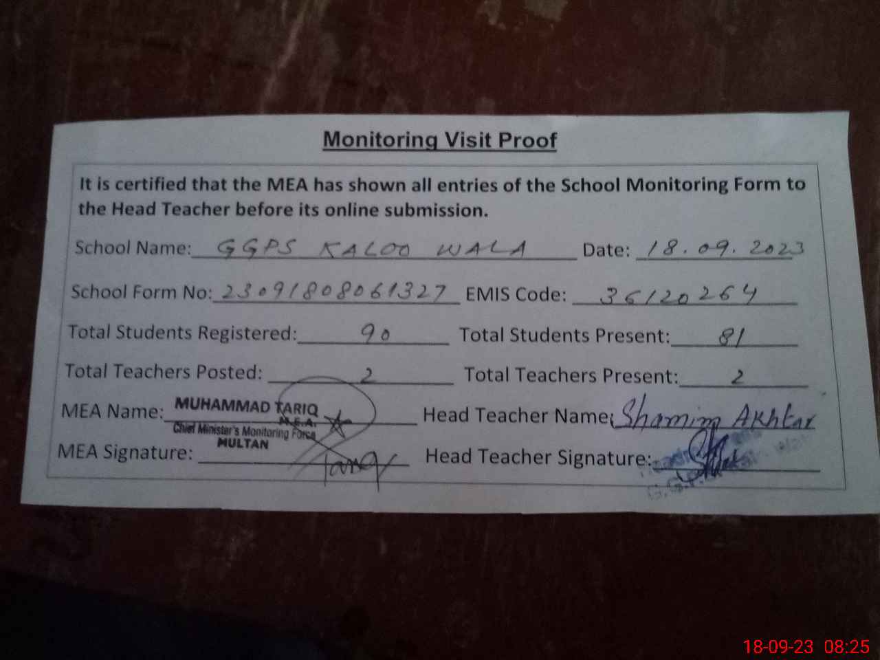 | Attendance Register | Head Teacher | MEA with School | Visit Proof |
