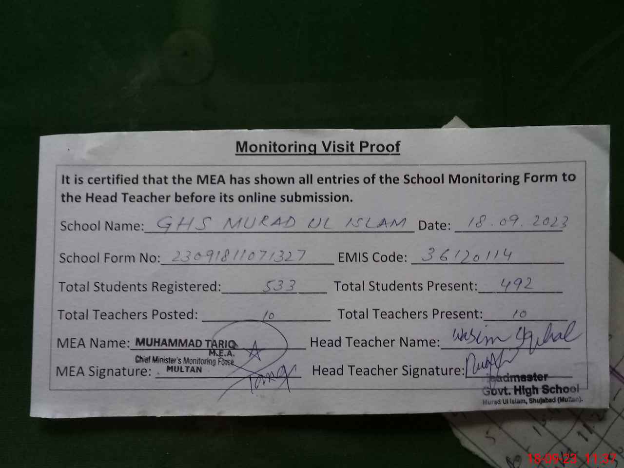 | Attendance Register | Head Teacher | MEA with School | Visit Proof |