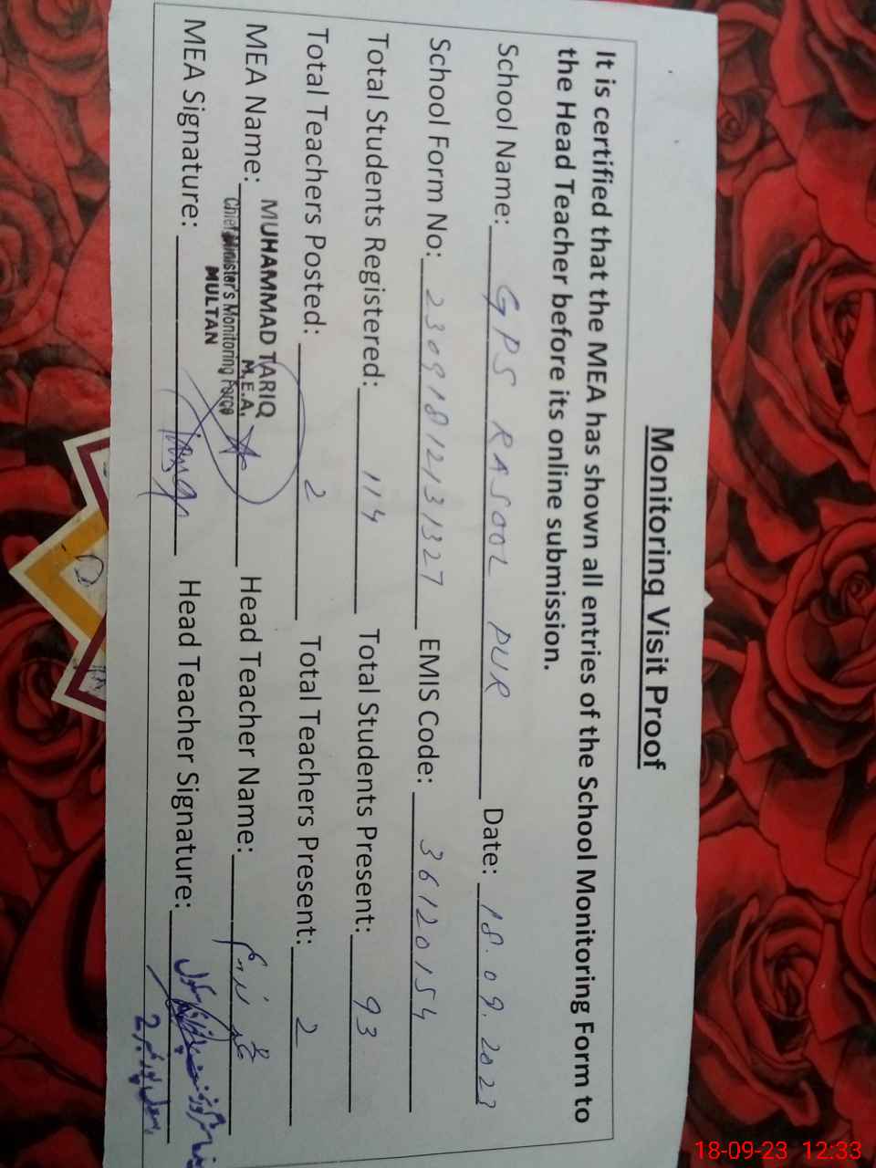 | EMIS Code: 36120154 | Name of School: GPS RASOOL PUR NO. 2 SHUJA ABAD | |||